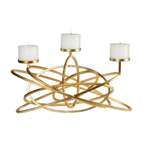 Fashionably designed in contemporary candelabra comprised of overlapping iron ovals, finished in lightly antiqued, metallic gold leaf with three, 5″x 4″ distressed white candles. It present a rich fusion of dynamic style and opulence that can add a modern accent to any setting.