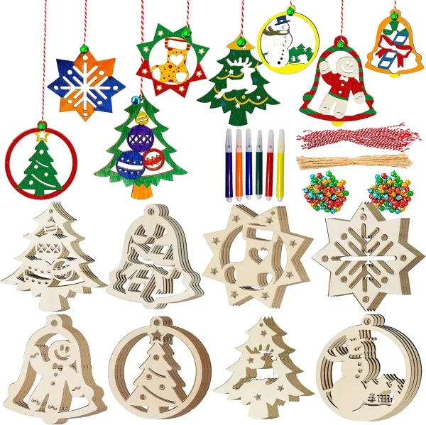 - Our Christmas wooden ornaments craft kit with color pens includes 48 pieces of plain wooden ornaments, comes with strings, red-white strings, bells and 6 colored markers. The plain wooden ornaments are made of sturdy, durable and eco-friendly wood, providing you with a better painting experience.