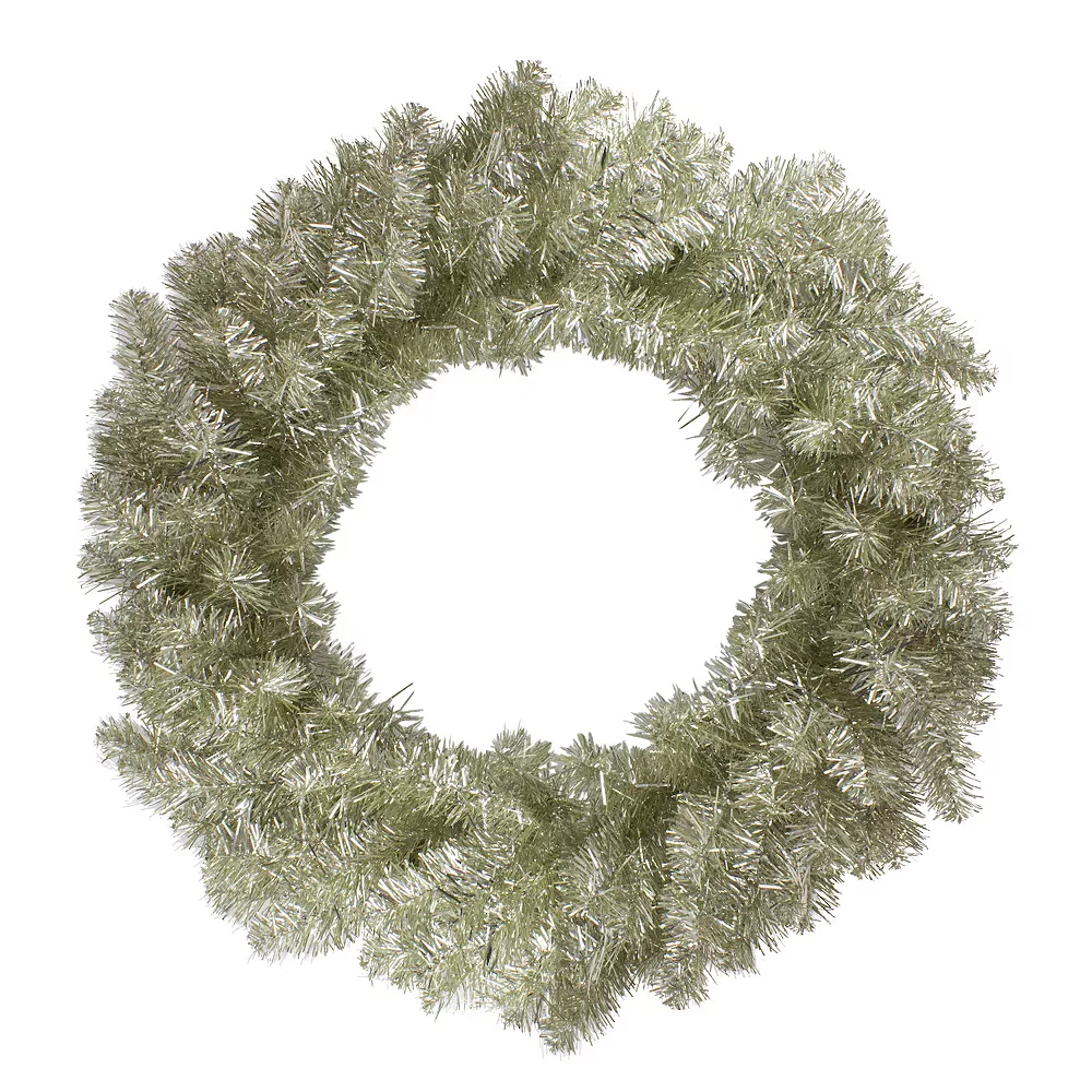 Are you non-traditional? This fun and festive wreath is for you. Features a metallic champagne gold and when in the light sparkles with silver tones too. Constructed like a traditional pine wreath it has 190 tips giving it incredible fullness. The double rings means more tinsel. making it super lush. Perfect for birthdays Christmas or Valentines day. Product Features: Unlit. 190 tips. 3 wide tips. For indoor use only. No assembly required – wreath comes in 1 piece. Includes a heavy duty double ring metal frame backing for hanging. Dimensions: 24 diameter (measured from outermost tip/edge to outermost tip/edge across the wreath). Inner diameter: 11. Material(s): PVC/metal. Note: Branches are compressed for shipment and need to be fluffed out upon arrival to look like the photo.