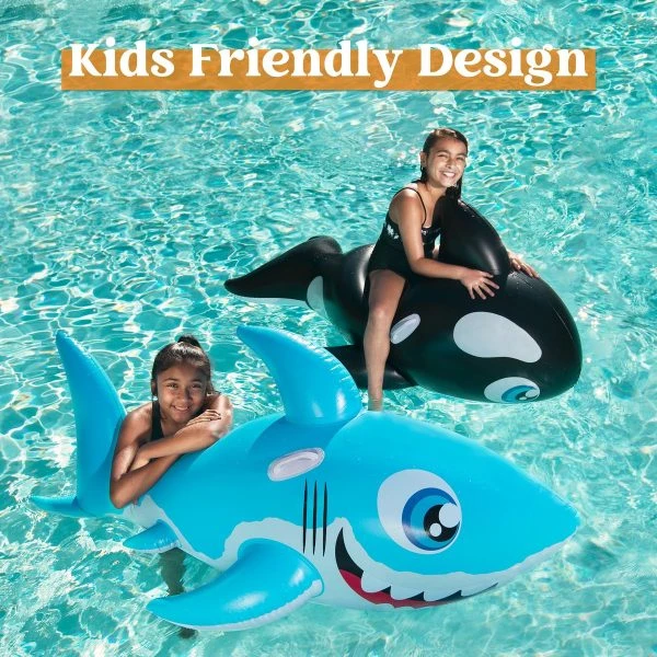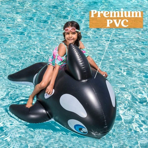 • Inflatable whale pool comes in 2 sets of ride-on inflatables. In black and blue colours perfect for girls and boys.