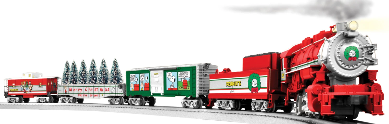 Here is a Lionel 6-30193 Peanuts Christmas Set. Peanuts® Christmas ready-to-run set (Conv. 0-8-0 steam loco). Celebrate Christmas with the Peanuts gang! The Locomotive in this set features: Transformer controlled forward, neutral, and reverse operation, Air whistle in tender, Operating headlight, Puffing smoke unit, Operating coupler on front of locomotive and rear of tender, Powerful maintenance-free motor, Traction tires, Die-cast metal locomotive body and frame and Engineer and fireman figures. The Rolling stock in this set features: Operating couplers, Trees loaded on gondola, Boxcar with opening doors and Interior illumination in caboose. Dimensions: Set length: approx. 47 / Layout: 40 x 60. Minimum curve: O-31. This set includes: 0-8-0 steam locomotive and tender, Gondola, Boxcar, Caboose, Three straight FasTrack track sections, one FasTrack terminal section, eight curved FasTrack track sections, CW-80 transformer and Smoke fluid.