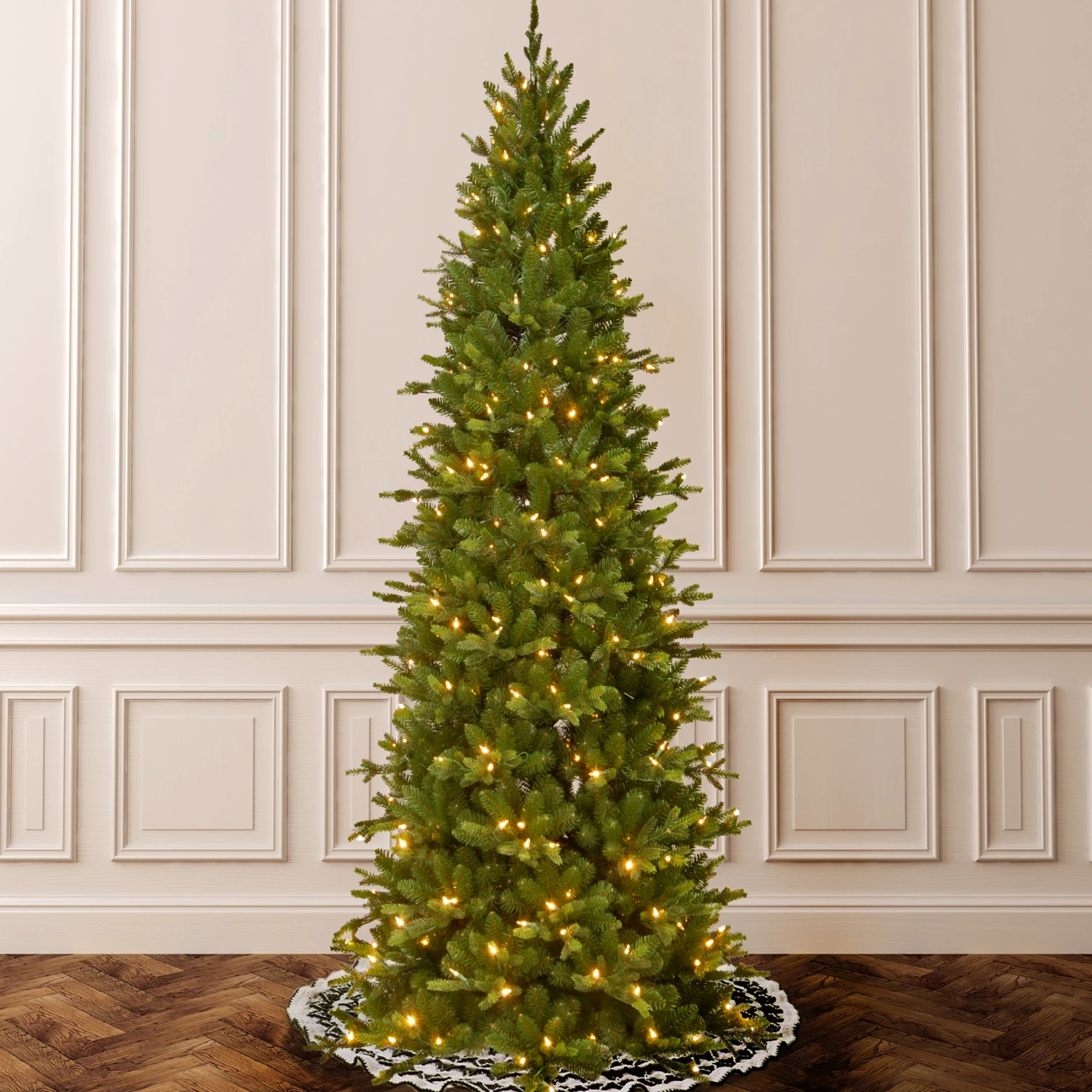 - This Ashland Spruce Pre-Lit Artificial Green Christmas Tree is 7.5 feet tall with a 38 inch base diameter. Featuring hundreds of ‘Feel Real’ individually crafted branch tips to create full bodied branches, this tree is designed to look and feel lifelike.