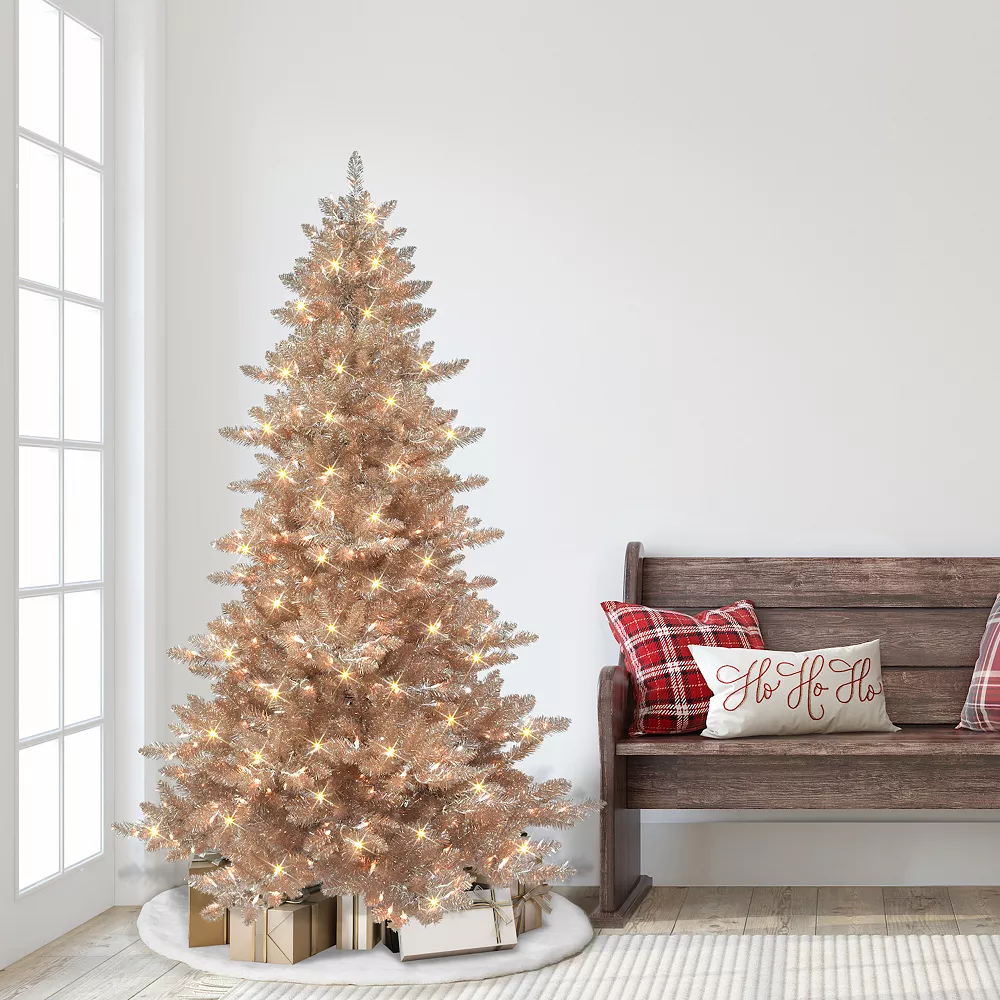 Accent your home with this Puleo International 6.5-ft. pre-lit royal majestic spruce rose gold artificial Christmas tree.